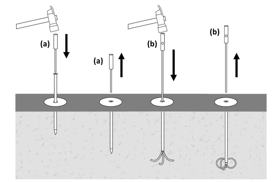 Le déploiement des tiges dans le sol se fait grace aux chocs (marteau), les amarres Fenox sont donc également appelées amarres à percussion.