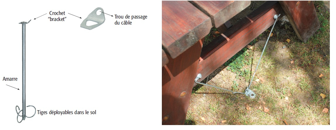 Les amarres s’utilisent avantageusement comme dispositifs antivol d’objets en extérieur. Il n’est pas rare de se faire voler du mobilier, des vélos, ou autres objets en milieu extérieur (jardins…). La sécurisation de ces objets n’est pas toujours évidente lorsqu’il n’y a rien pour s’accrocher (pas de barrière ni poteau, pas d’arbres…). Dans ces conditions l’amarre peut s’avérer très utile car elle constitue un point d’ancrage solide dans le sol sur lequel peut s’accrocher un câble antivol permettant de sécuriser les objets. La photo ci-après montre une table de pique-nique avec dispositif antivol avec amarre Fenox. L’amarre est équipée d’un crochet (appelé « crochet bracket ») sur lequel on peut fixer un câble lui-même accroché à la table.
