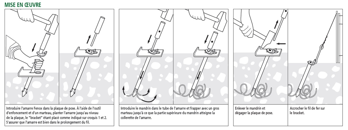 La mise en œuvre de l’amarre Fenox est représentée ci-dessous ; nous pouvons voir chaque étape de pose :