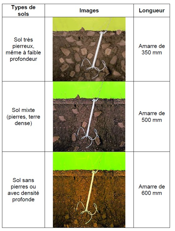 Il existe bien évidemment des couches inférieures de sol plus dures que les couches supérieures. Dans ce cas, il est bien sûr plus approprié d’utiliser une amarre plus longue, permettant aux 3 tiges d’arrimage de l’amarre d’être déployées dans une couche plus dure que ce qu’on a en surface…