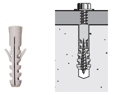 Il y a les chevilles plastiques et/ou nylon pour la fixation légère. On peut trouver sur le marché des chevilles plastiques seules qui peuvent s’associer avec diverses vis, ou bien des chevilles plastiques qui sont conditionnées avec les vis (la cheville est conçue pour fonctionner avec la vis associée).