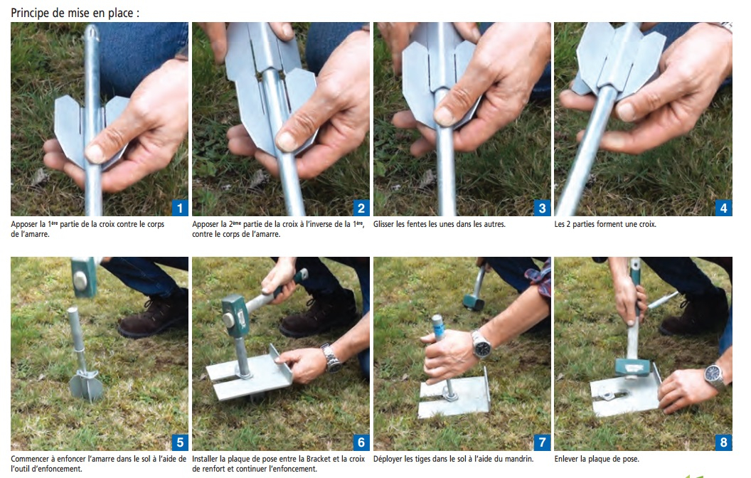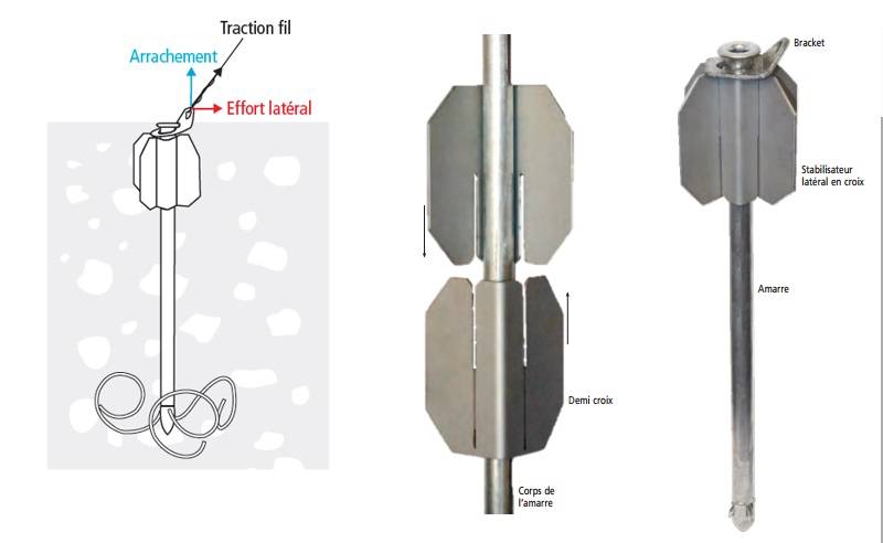 Cette croix de renfort latérale éviter le cisaillement de la terre par le corps de l’ancrage. Cette option supplémentaire est très facile à installer sur les amarres Fenox, car la croix est composée de deux parties qui s’emboitent autour de l’amarre. Les photos ci-après montrent la mise en œuvre aisée de ce dispositif :