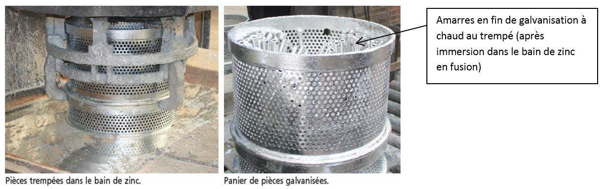 La photo suivante montre la galvanisation des amarres Fenox plongées dans un bain de zinc en fusion (amarres à l’intérieur du panier percé, laissant passer le zinc en fusion) :