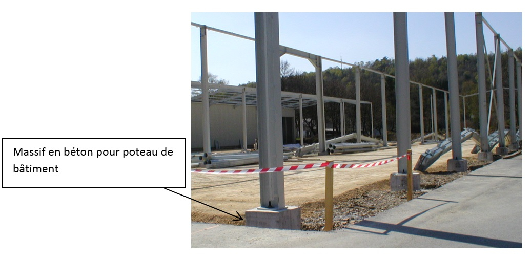 La photo ci-après montre les massifs en béton lors de la construction d’un bâtiment. Les poteaux sont fixés par des crosses ou cannes d’ancrage noyées dans le massif béton (la partie filetée des crosses d’ancrages permet de se relier à la platine des poteaux) :