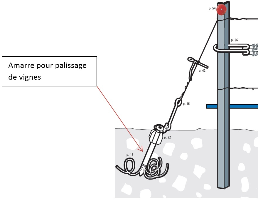 En effet, les amarres sont par ailleurs très couramment utilisées dans les vignobles pour fixer dans le sol les fils des palissages de vignes (Amarres Fenox) :