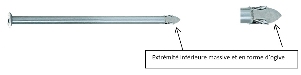 A l’intérieur du tube sont pré-positionnées 3 tiges en acier prêtes à sortir du tube au niveau de l’extrémité inférieure par 3 lumières disposées à 120° sur le pourtour de l’ogive.