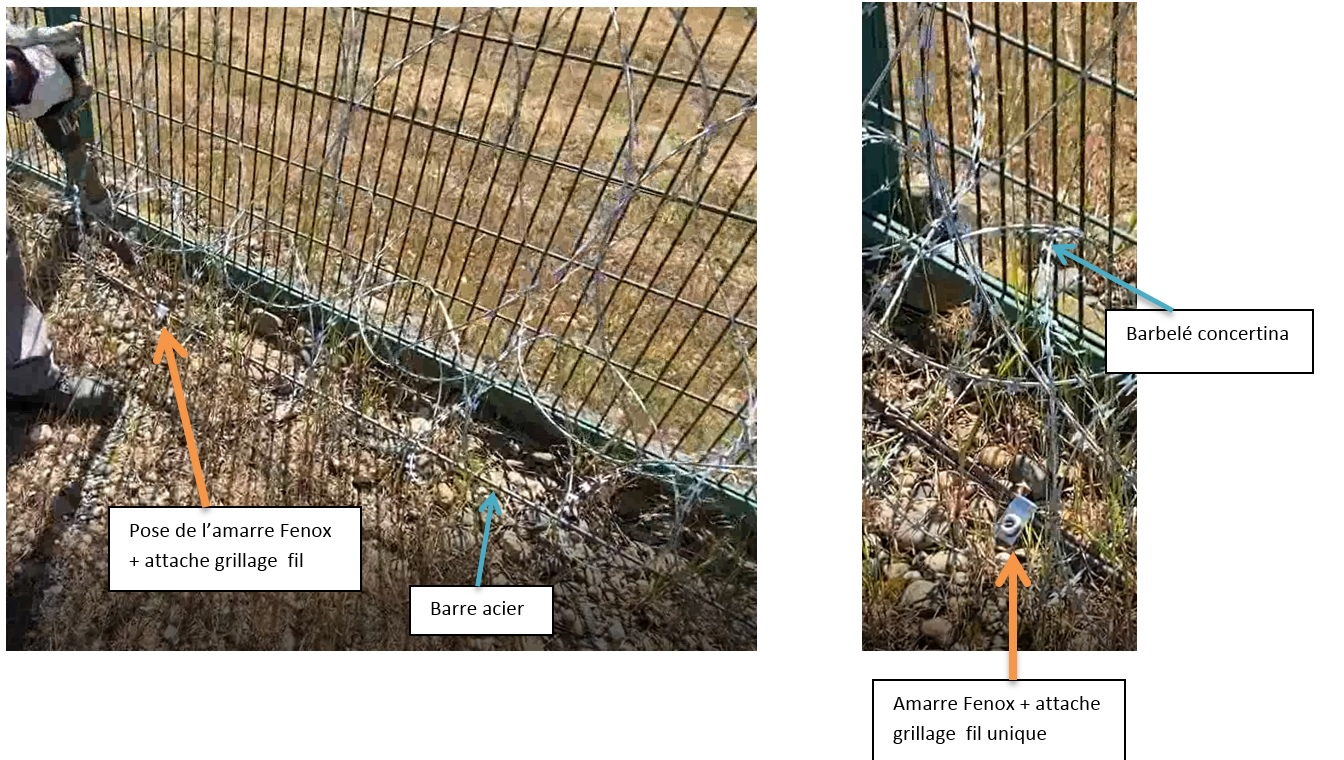 Dans le domaine des clôtures, il existe des dispositifs de sécurisation de sites sensibles (militaires, nucléaires, zones interdites…) où l’on doit fixer au sol des fils barbelés concertina (fils de fer barbelés doté d’éléments pointus et tranchants de type lame de rasoir). Les spires des bobines Concertina sont déroulées sur le sol pour sécuriser un site, mais il convient de fixer ces spires concertina au sol. L’amarre Fenox permet de fixer parfaitement ces spires de bobines concertina au sol au moyen de l’attache grillage fil unique. Les photos ci-dessous montrent la fixation ou le verrouillage des spires concertina au sol. Ici le monteur installe une barre de métal au bas à l’intérieur des spires concertina et verrouille la barre avec le système amarre Fenox et attache grillage fil unique. De cette manière l’installateur a fixé sa barrière en fil barbelé concertina au sol de manière efficace et ce derrière une clôture grillagée à mailles soudées.