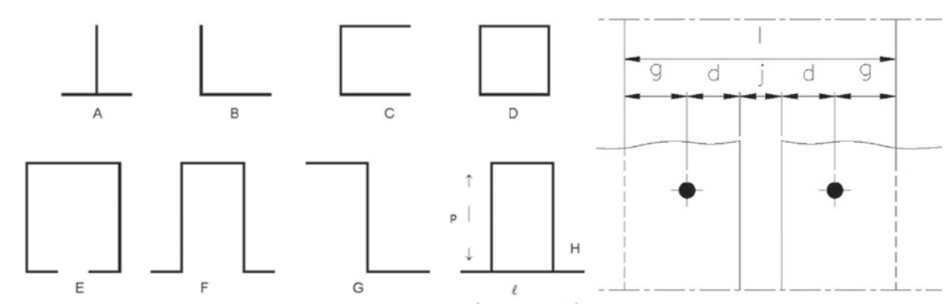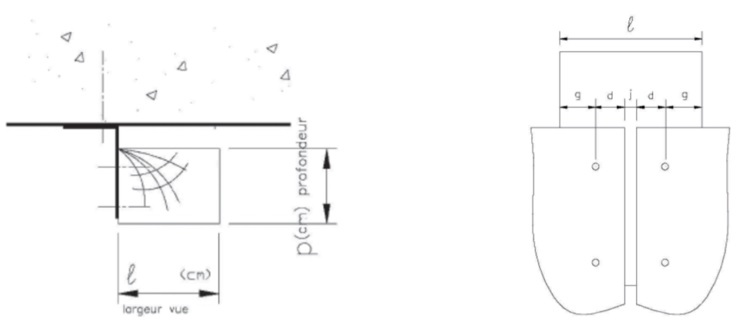 En ce qui concerne la largeur vue ℓ, celle-ci doit permettre de prendre en compte l’ouvertrure du joint de parement j , la distance d entre l’axe des fixations et le bord du parement (précisée dans les avis techniques) et la garde g entre la fixation et le bord du profilé (≥ 2x Øvis)