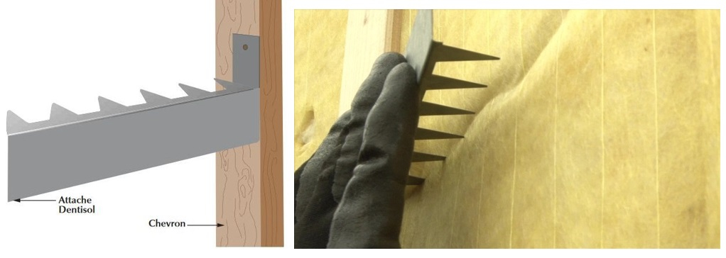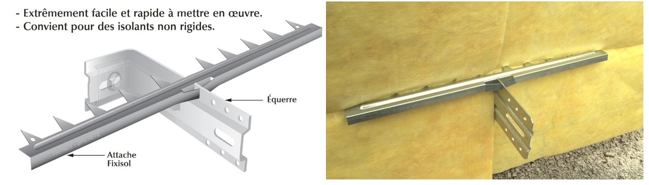 L'attache FIXISOL se place sur les équerres Faynot. Elle coulisse sur le bord supérieur grâce à deux rainures de guidage et une fente définie par deux pattes élastiques empêchant son recul. La partie avant de l'attache FIXISOL est en forme de râteau, (dents destinées à pénétrer dans l'isolant et assurer son maintien).