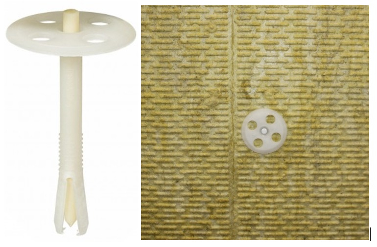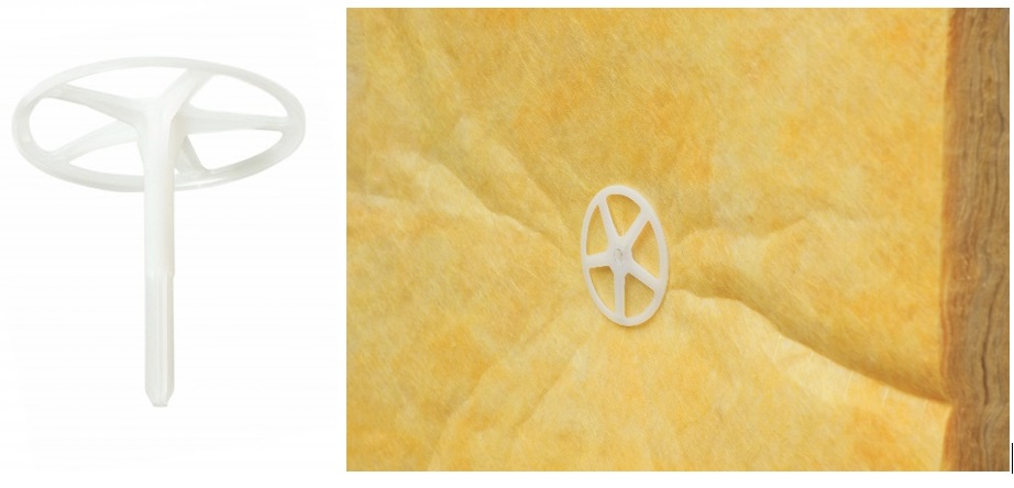 Fixation d’isolants à l’aide de chevilles étoiles moulées en matière plastique et présentant une collerette large.