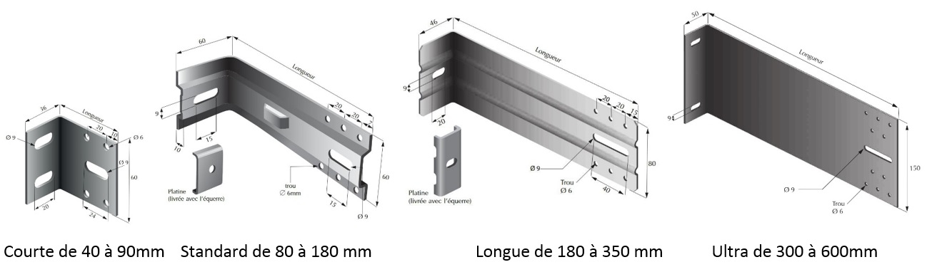 Ces équerres sont en Acier S220GD conformément à la norme NF EN 10 346, avec des protections contre la corrosion Z275 ou Z450 selon l’environnement. Il existe également des équerres en plastique, aluminium, inox… mais ces matériaux sont bien moins résistants ou beaucoup plus chers.